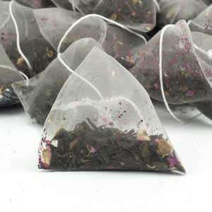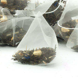 These pyramid teabags are made from plant based material (sugar cane, corn or abaca). Both these materials are bio-degradable and are produced by creating a thread that is woven on large looms. This material allows the loose leaf teas to be seen and of course to infuse well too.